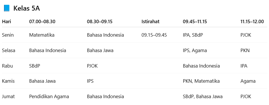 Jadwal pelajaran untuk kelas 5A. |