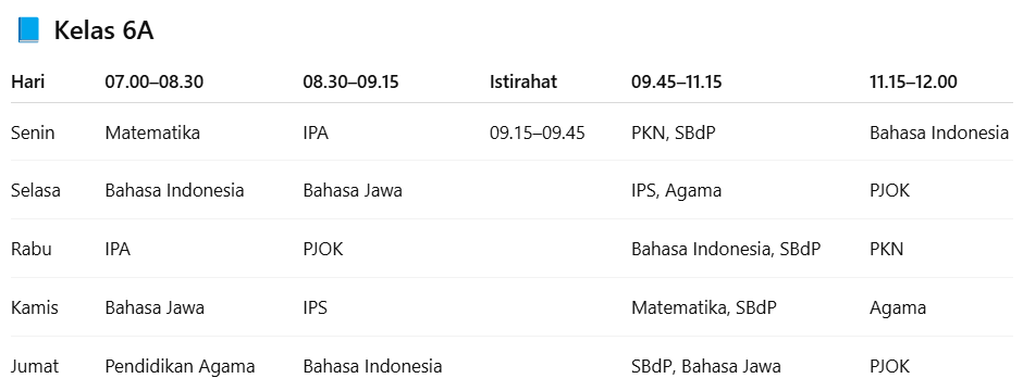 Jadwal pelajaran untuk kelas 6A. |