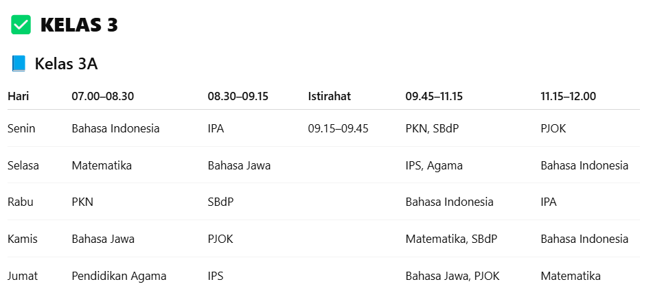 Jadwal pelajaran untuk kelas 3A. |