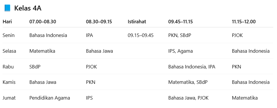 Jadwal pelajaran untuk kelas 4A. |