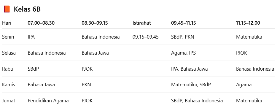 Jadwal pelajaran untuk kelas 6B. |