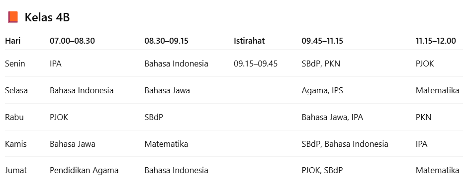 Jadwal pelajaran untuk kelas 4B. |