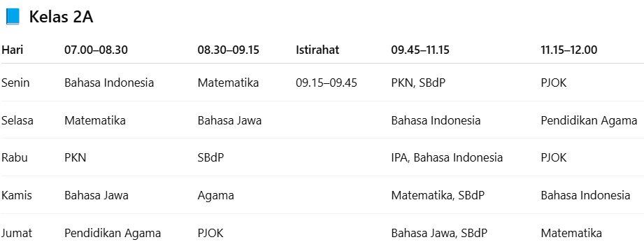 Jadwal pelajaran untuk kelas 2A. |