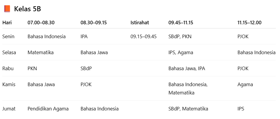 Jadwal pelajaran untuk kelas 5B. |