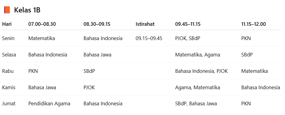 Jadwal pelajaran untuk kelas 1B. |