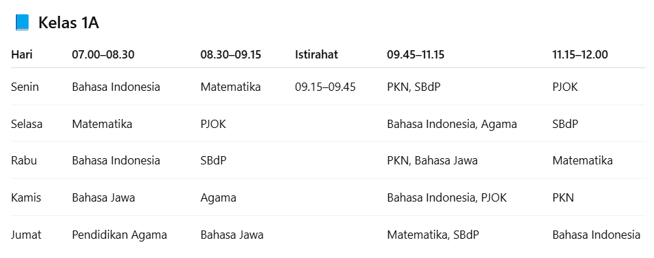 Jadwal pelajaran untuk kelas 1A. |