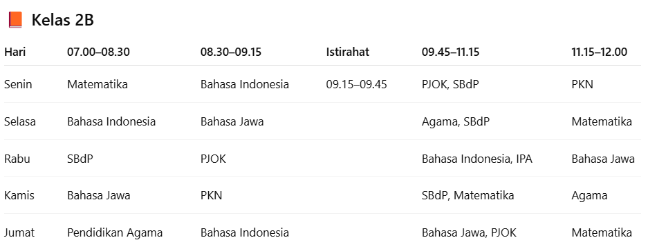 Jadwal pelajaran untuk kelas 2B. |