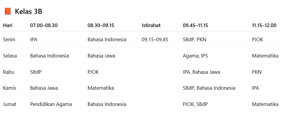 Jadwal pelajaran untuk kelas 3B. |
